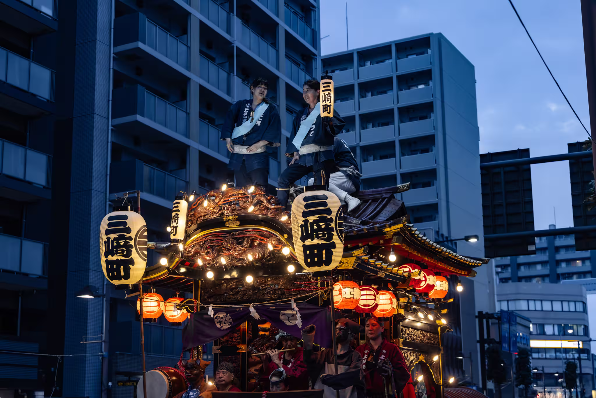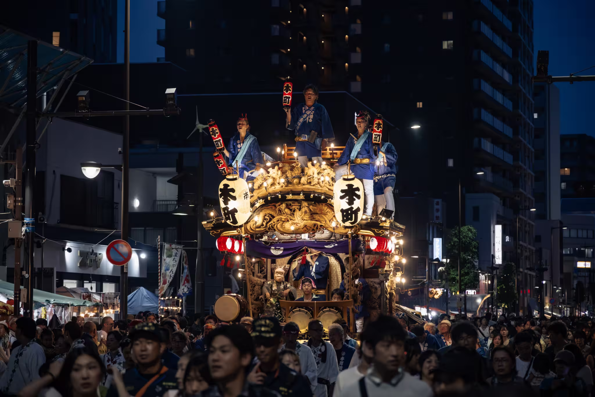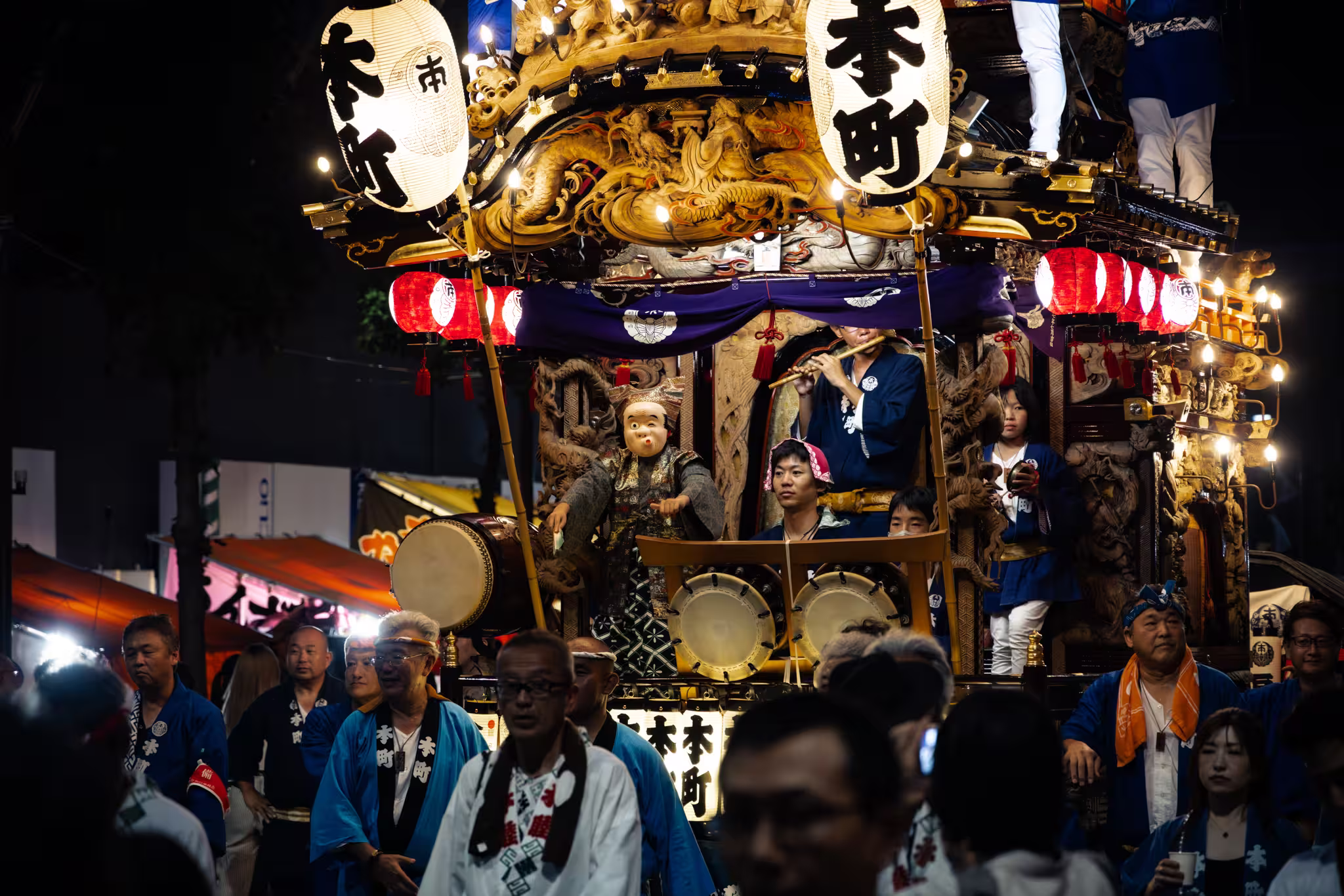 This is the main act, and they come alive roughly when the sun goes down. These wheeled floats are among the biggest in the Kanto region. It’s impossible to miss them, as they are covered in lights that give them a ghostly appearance. Intricate carvings decorate them, and they carry musicians and dancers, some of whom are perched at the very top carrying lanterns.