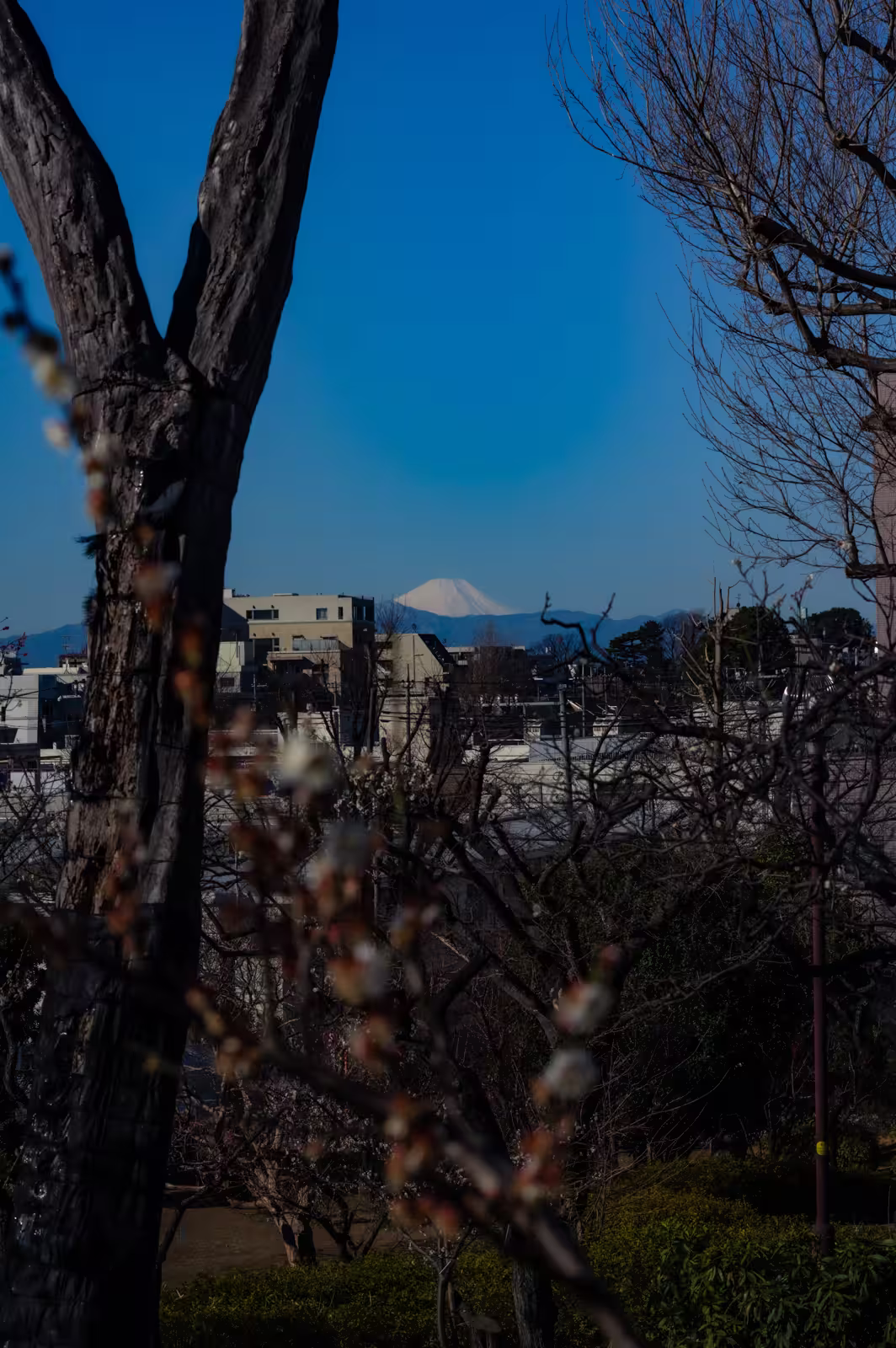 Hanegi Park plum blossoms frame a distant, snow-capped Mount Fuji and cityscape under a deep blue sky.