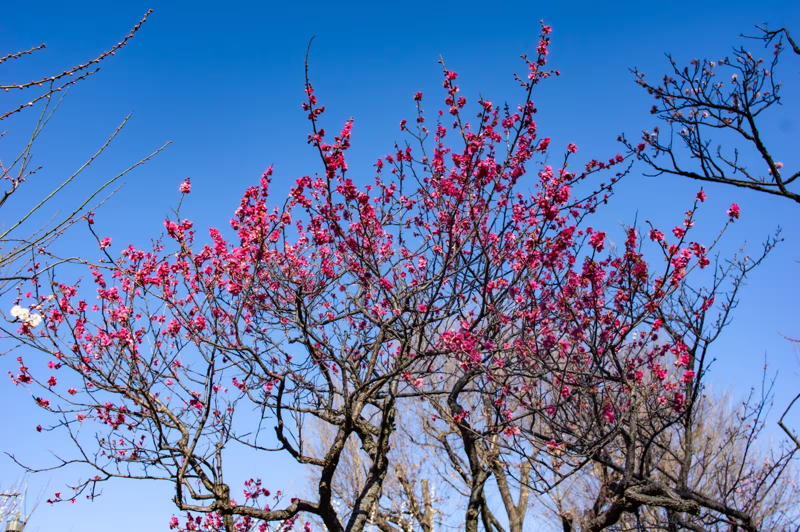 White Hanegi Park plum blossoms bloom on dark branches against a clear, deep blue sky.