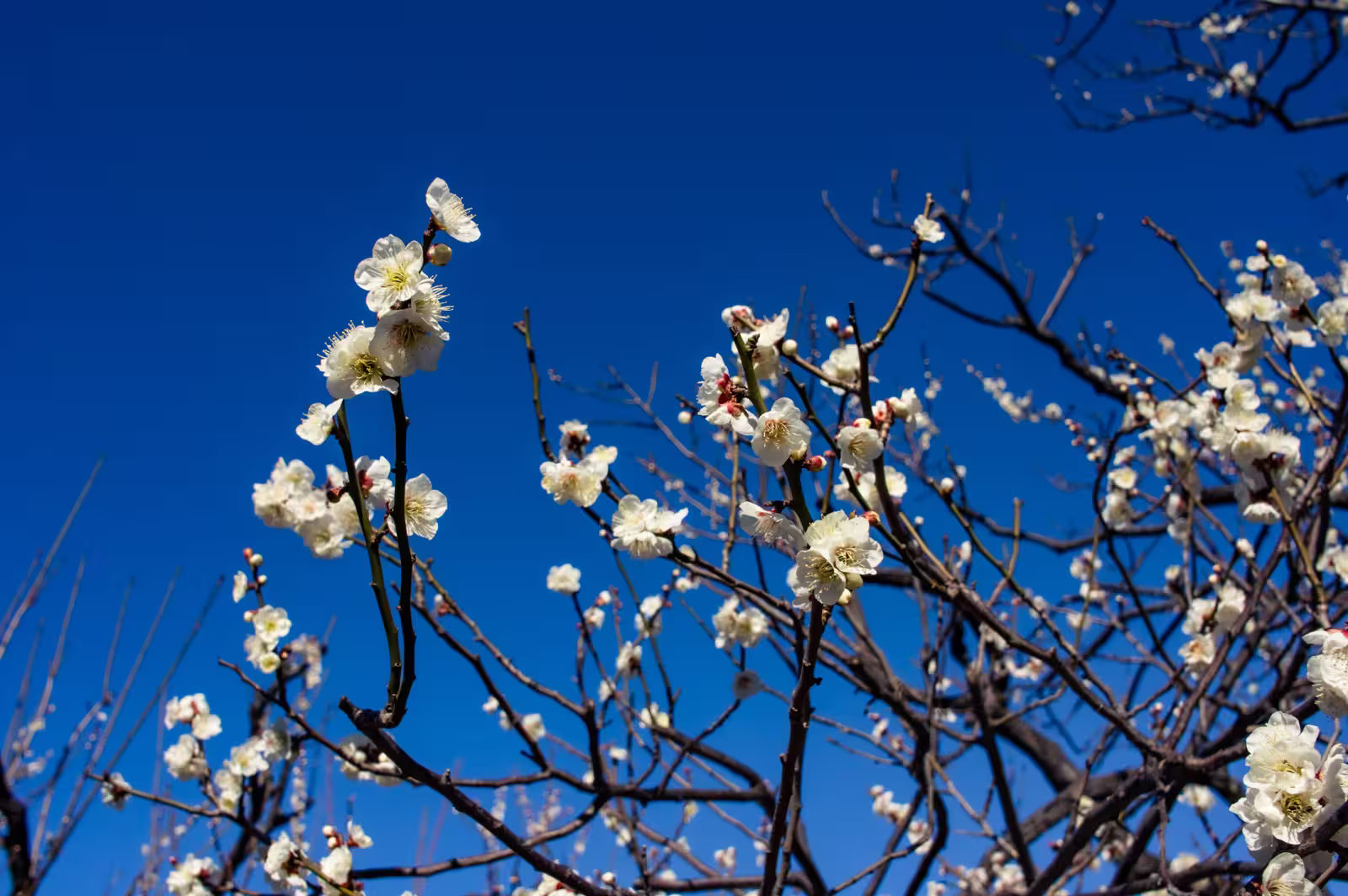 Close-up of white Hanegi Park plum blossoms on dark branches against a clear, deep blue sky.