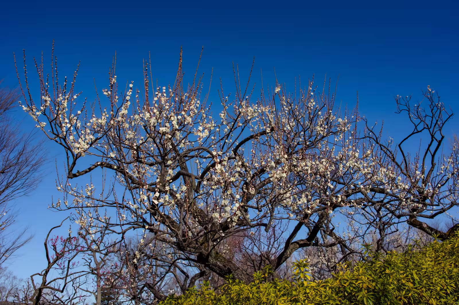 Hanegi Park plum blossoms bloom on twisted dark branches under a clear blue sky above a green hedge.