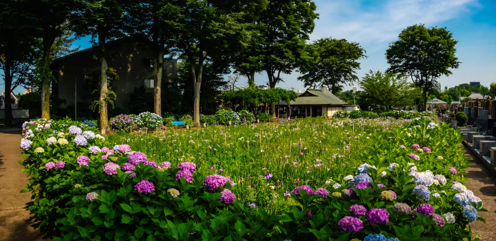 One of the last places I visited for hydrangeas (ajisai) in 2017 was Myōhōji Temple, tucked away in Tokyo’s Suginami Ward. I arrived quite late in the season, and many of the flowers were already beginning to fade. Still, the hour-long walk from my apartment was well worth it; even past their peak, the blooms offered a quiet, beauty that I enjoyed photographing.