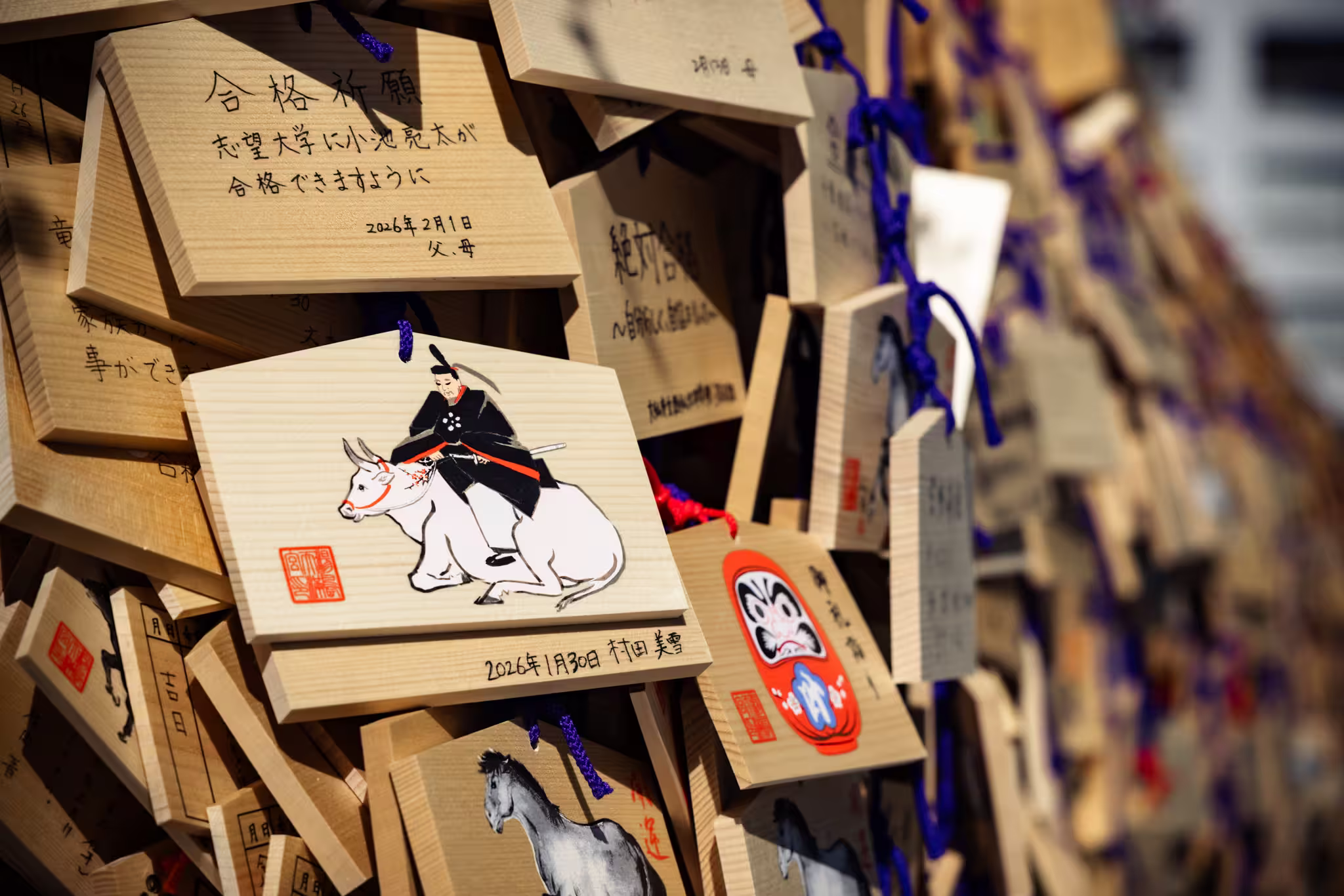 - Remember the ema? When people need divine help, they write their dreams or wishes on these wooden prayer plaques and hang them on the racks (symbolic “trees”) around shrines. And as Michizane is a kami of study, most are requests to him. Students request him for help in passing tests. During exam season, these things are stacked many deep!